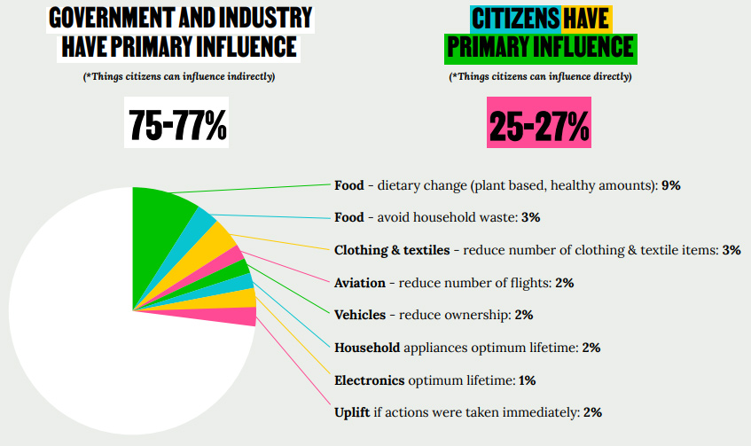 “Citizens and communities are not powerless. Their action is meaningful, impactful, and actually needed if we are to avoid ecological breakdown.” And they can put a specific figure on it: “If citizens in high consuming countries act now, they have primary influence over 25-27% of the savings needed by 2030 to avoid ecological meltdown – by making clear, constructive, and doable lifestyle changes.”