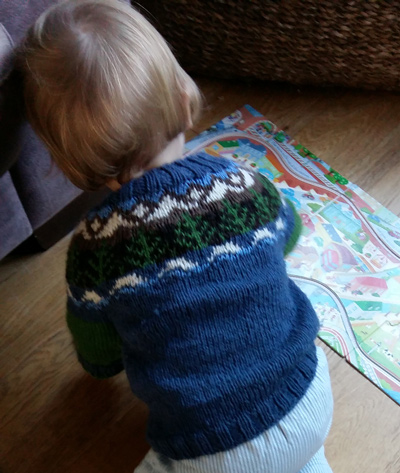 In 2020, my third son was born, and being a knitter, I started to think about what I could make to wrap up this new precious bundle. Being of a frugal disposition, I wondered what I could make without buying anything new. Kester’s cardigan was mainly chewed in the chest area and I thought about keeping the sleeves and lower body and re-knitting the chest to the same pattern, with some other yarn. This didn’t seem the best way to go about things though, and in the end I unravelled the whole of the cardigan, composting the lengths of wool that were too short to be re-knitted. I then found a new pattern with a beautiful picture of sea, trees and mountains round the yoke. I combined the unravelled dark blue wool with scraps left over from other projects. The new sweater is beautiful and warm. And because it’s made from scraps and unravellings, it was free to make and gives me a lovely reminder of other people and the clothing they wore.