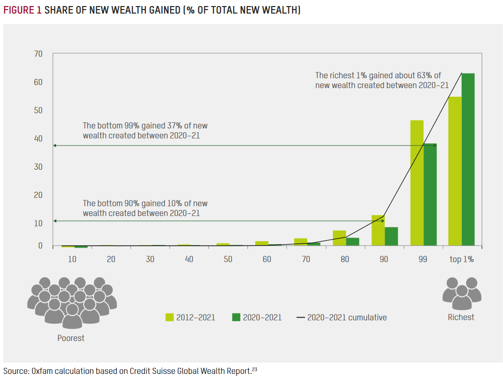 Released to coincide with the World Economic Forum, it shows very clearly how the global economy serves the richest first. It includes this graph of the distribution of new wealth created in 2020 and 2021: